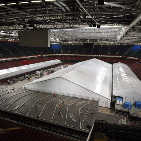 The second largest temporary hospital in the UK, the combined team built a brand new temporary hospital and supporting infrastructure within The Principality stadium in just weeks. It is a ‘step-up and step-down’ hospital with patients requiring rehabilitation and support as part of their recovery and sadly for some, end of life palliative care. The hospital also included full radiology, laboratory space, a CT Scanner in lead-lined room, mortuary and oxygen tanks. At its peak the programme involved over 50 NHS staff, 600 contractors on site, and over 30 different companies delivering over 250,000 man hours.